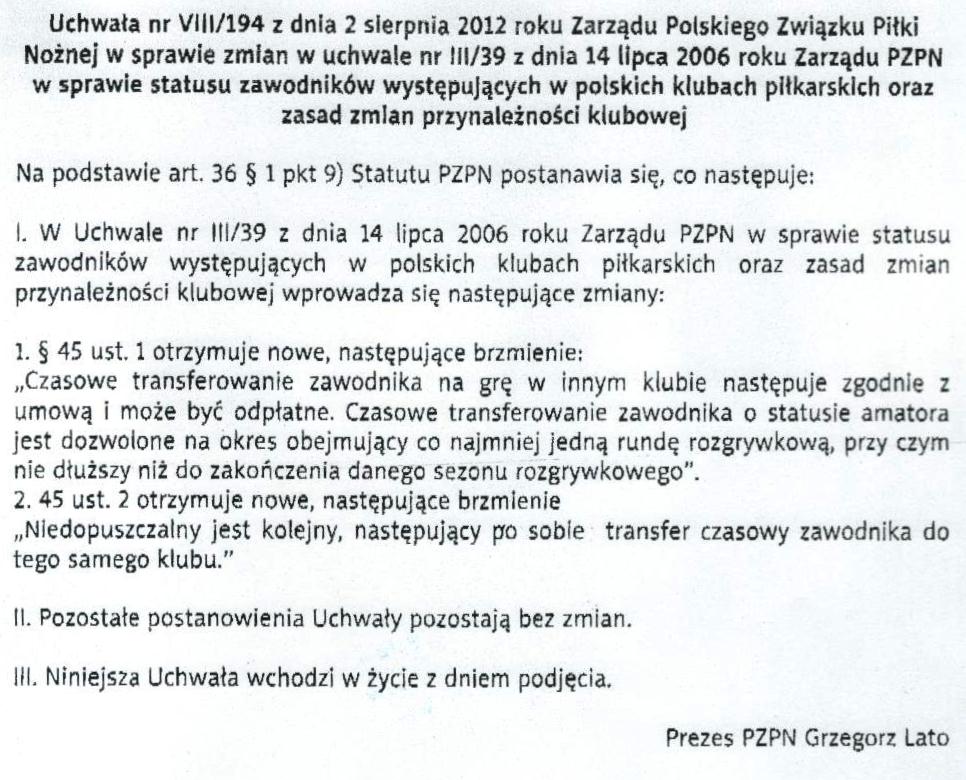 Zarząd PZPN w dniu 02-08-2012 podjął uchwałę zmieniającą